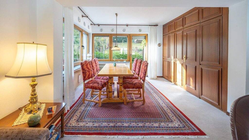 Das EG könnte als abgeschlossen Einheit genutzt werden und überzeugt mit einem großen Wohn- und Essbereich, der wohlig über einen Kaminofen beheizt werden kann. Der Essbereich ist fast schon Wintergarten-ähnlich hell, dank vieler Fenster - alle samt mit Blick den Garten. Hier sitzt man gerne, hier lädt man gerne ein! Dazu gibt erwartet Sie neben einem Gäste-WC, ein Schlaftrakt mit drei (Schlaf-) Zimmern und großer Wellness-Oase (Bad) mit Dusche, Badewanne und Sauna.