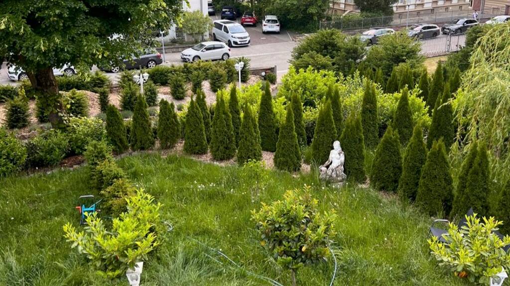 Das parkähnliche Grundstück mit rund 1.650 m² Fläche öffnet sich wie eine grüne Oase mitten im Kurviertel - Raum zur Entfaltung, zum Durchatmen, zum Sein.