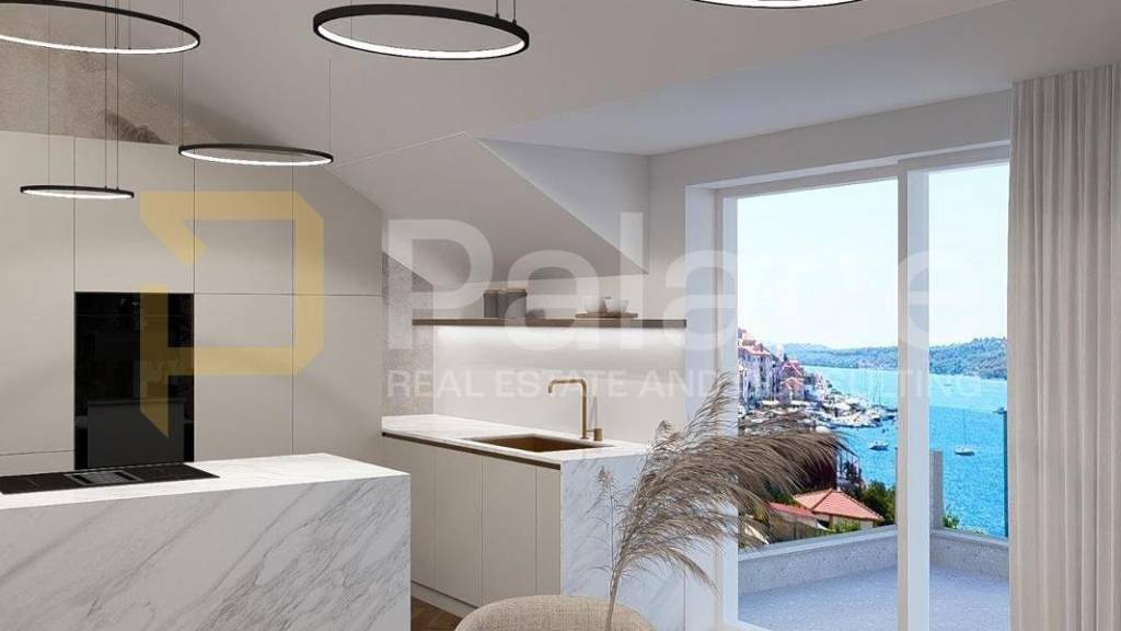 Die Wohnung erstreckt sich über zwei Etagen mit einer Gesamtfläche von 138,97 m2. Im Erdgeschoss befindet sich eine offene Küche, ein Esszimmer und ein Wohnzimmer mit einem wunderschönen Blick auf den Kanal von Sibenik, die Kathedrale St. Jakob und die Stadt.