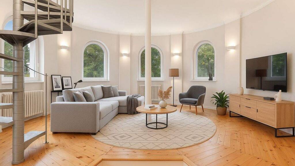 Im oberen Geschoss befindet sich der zweite, lichtdurchflutete Turmraum, der mit seiner 360-Grad-Fensterfront beeindruckt. Er eignet sich ideal als Schlafzimmer, Atelier oder stilvoller Arbeitsbereich. Ein eigener Außenstellplatz rundet dieses außergewöhnliche Angebot ab - perfekt für Kenner, die das Besondere suchen.