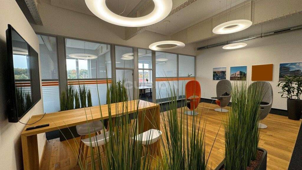 Zur Verfügung stehen insgesamt rund 1.500 m² Bürofläche, aufgeteilt in ca. 800 m² im 1. Obergeschoss sowie ca. 700 m² im 2. Obergeschoss. Die Etagen bieten vielseitige Gestaltungsmöglichkeiten - von offenen Arbeitslandschaften bis hin zu klar strukturierten Büro- und Besprechungsbereichen. Glaswände unterstützen dabei eine helle, transparente Raumwirkung.
