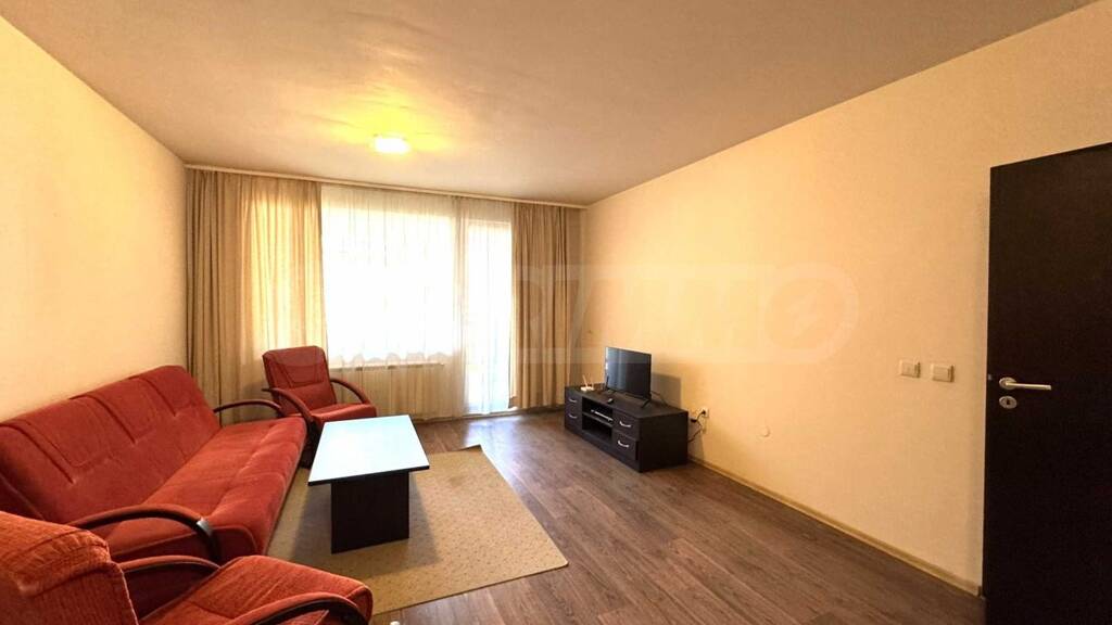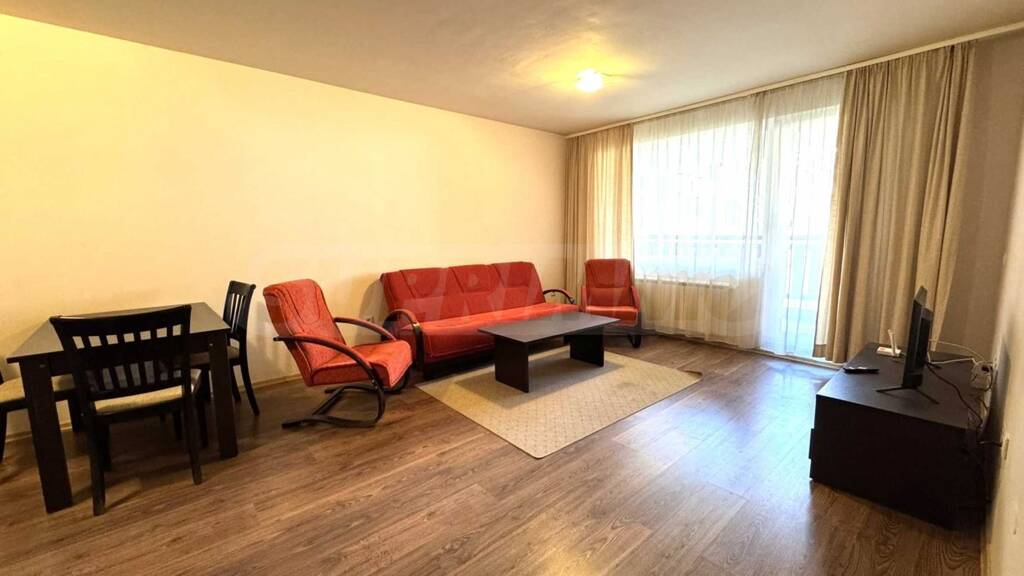 geräumiges Wohnzimmer mit Sofas, Fernseher und Balkon mit Blick auf den Innenhof und das Pirin-Gebirge;