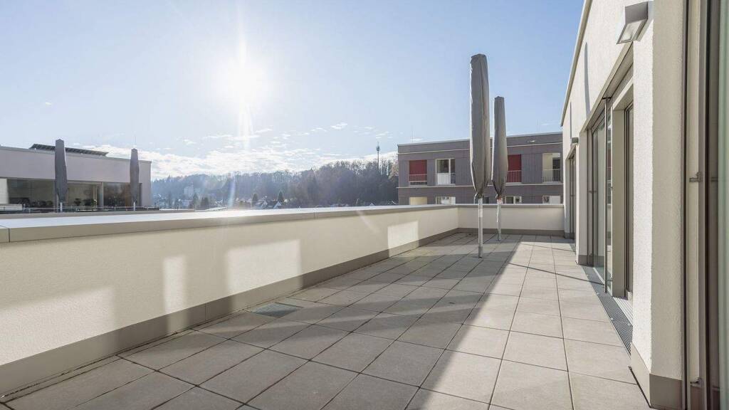 großzügiger Wohn- und Essbereich mit Zugang zur Dachterrasse offene Küche mit voll ausgestatteter Einbauküche und anschließender Abstellkammer mit WM-Anschluss zwei separate Schlafzimmer (ein Schlafzimmer mit integrierter Ankleide) zwei Badezimmer mit Dusche, Waschbecken und WC Zudem gehört zur Wohnung noch ein Kellerabteil sowie ein Tiefgaragenstellplatz (120,-€ mtl.) im Untergeschoss.
