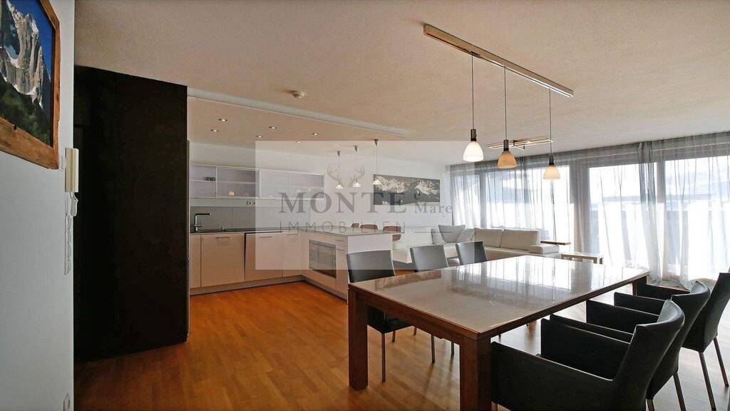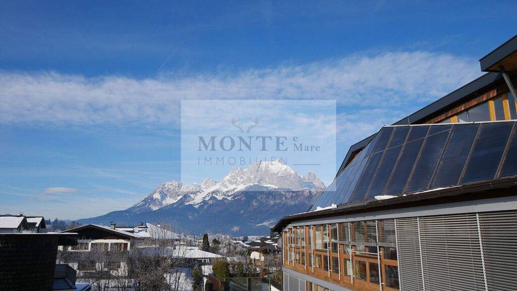 Der Wohn-Essbereich gestaltet sich offen und modern. Die helle Einbauküche integriert sich perfekt in den Raum, der sich nach außen hin mit Blick Richtung Kitzbüheler Horn öffnet. Der Balkon lädt zum Entspannen und zum Genießen der Ausicht auf den Wilden Kaiser ein.