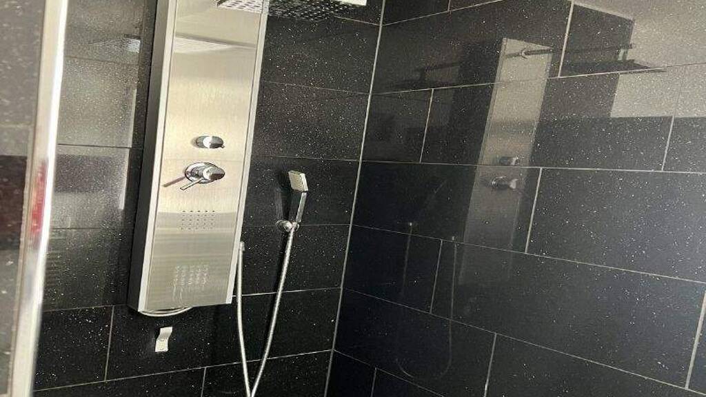 Über das Duschbad, das mit seinen schwarzen und roten Steinfliesen einen luxuriösen Eindruck erzeugt, erreicht man das geräumige Schlafzimmer. Zwei Einzelbetten sind zu einem Doppelbett zusammengestellt und der Weichholz-Schrank bietet Platz für die Kleidung. Auch hier liegen die Fenster über Eck und sorgen tagsüber, falls erwünscht, für angenehme Helligkeit.