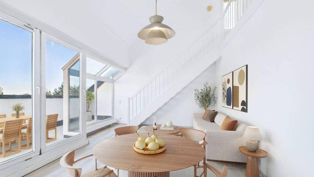 Das Herzstück der Wohnung ist ohne Zweifel der lichtdurchflutete Wohnbereich. Ein großes Fensterelement öffnet den Raum zur uneinsehbaren Dachterrasse hin, auf der Sie den traumhaften Fernblick Richtung Süd-Osten genießen können - ideal für Frühstück in der Morgensonne, entspannte Abende oder kleine Auszeiten zwischendurch.