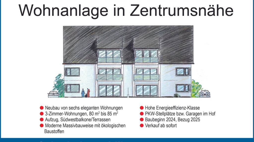 Ebenso finden Sie Restaurants, Pizzeria, sowie Bäckereien und Metzgerei in geringer Entfernung. Dreizimmerwohnungen Elegante Dreizimmerwohnungen mit Keller und je einem Pkw-Stellplatz, sowie Garage. Besichtigungstermine Jederzeit telefonisch zu vereinbaren Stichworte Versorgung: Städtische Wasserversorgung