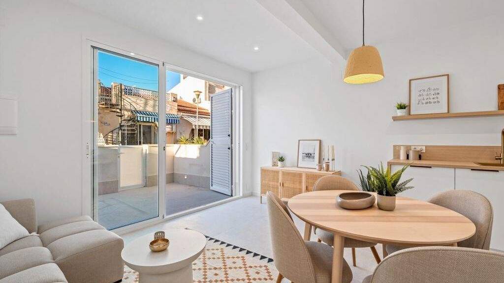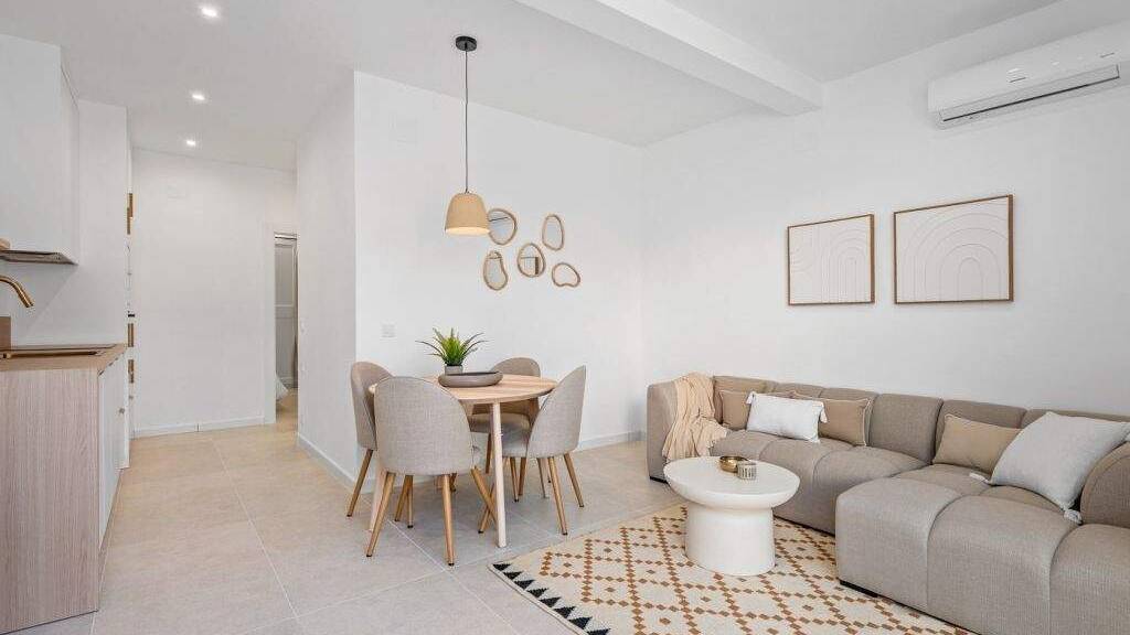 Moderne und helle Immobilie mit 59 m² Wohnfläche, kürzlich renoviert, mit einem durchdachten zeitgenössischen Design und neutralen Oberflächen, die Wärme und Großzügigkeit vermitteln.Die Raumaufteilung umfasst 2 Schlafzimmer, ein komplettes Badezimmer sowie einen angenehmen offenen Wohn- und Essbereich mit voll ausgestatteter, integrierter Küche. Die Küche ist zum Wohnbereich hin offen und schafft eine funktionale und einladende Atmosphäre für den Alltag.Das Wohnzimmer hat direkten Zugang zu einer privaten Terrasse, ideal für Frühstück im Freien oder entspannte Momente, und verfügt über große Fenster für hervorragenden Lichteinfall den ganzen Tag über.