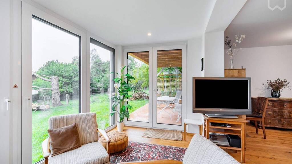 Schöne helle Wohnung in Steinebach am Wörthsee. Ein geräumiger Wohn- und Küchenbereich mit bodentiefen Fenstern zum Garten, sowie ein Schlafzimmer.