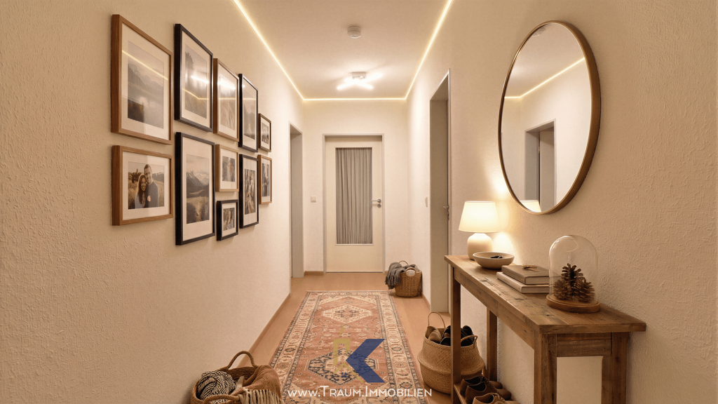 Die Böden in Holzoptik schaffen eine warme und einladende Atmosphäre. Ein separates Kellerabteil bieten zusätzlichen Komfort.