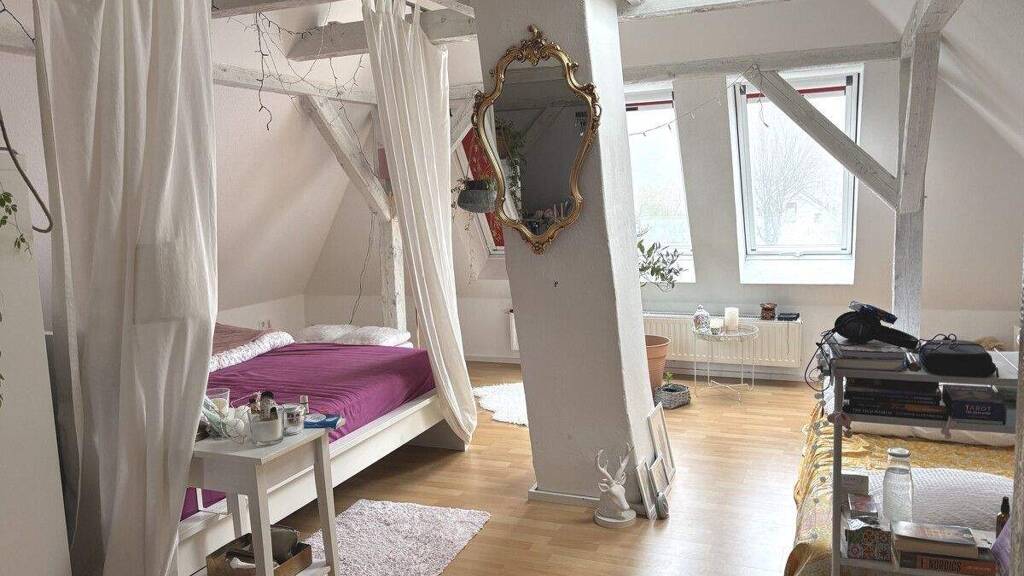Der ausgebaute Dachboden beherbergt einen großen Raum mit offener Holzbalkendecke. Durch diese Bauweise wirkt der Bereich besonders offen und wohnlich und eignet sich ideal als Studio, Hobbyraum oder zusätzlicher Wohnbereich.