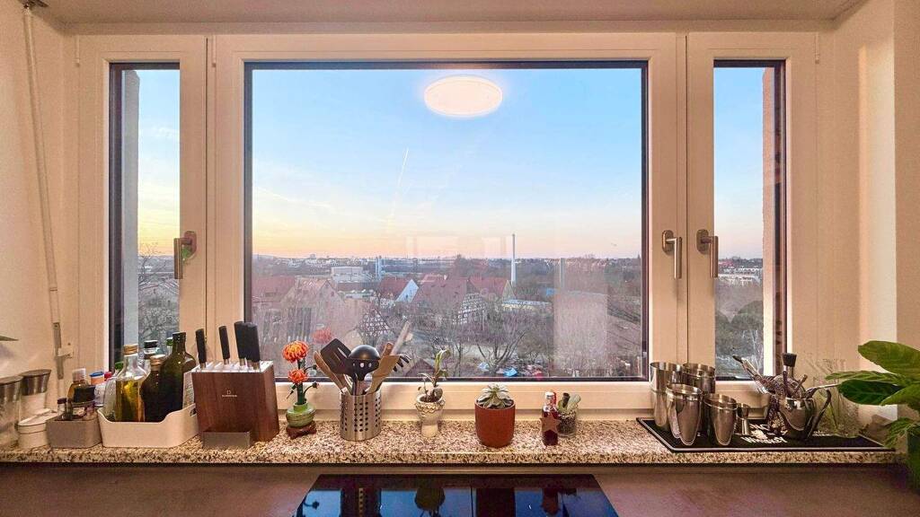 Großzügige Loggia als wetterunabhängiger Balkon, begehbar vom Wohnzimmer sowie vom Kinder-/Arbeitszimmer. Herrlicher Blick bis zur Nürnberger Kaiserburg.