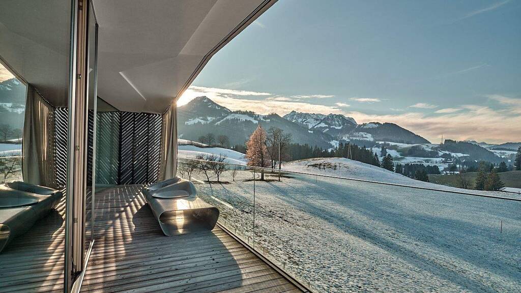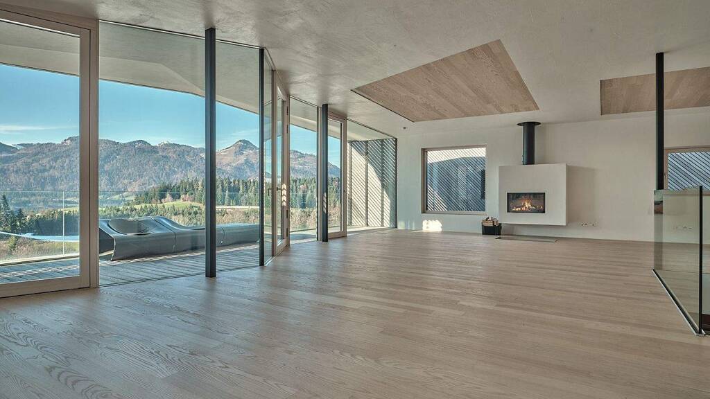 Eine elegante Treppe führt in das Obergeschoss, wo sich der lichtdurchflutete Wohn- und Essbereich mit großformatigen Panoramafenstern und Balkon öffnet. Der Blick auf die umliegende Bergwelt ist schlicht atemberaubend. Ein stilvoller Holzkamin schafft in den Abendstunden eine warme, alpine Atmosphäre.