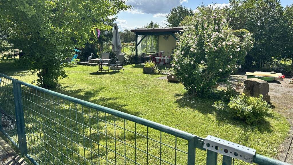 Das Grundstück ist ein echtes Highlight: Ein idyllischer und großer Garten mit Teich, gepflasterten Wegen und Platz zum Entspannen, Spielen oder Gärtnern. Die vorhandenen Nebengebäude bieten weiteren Stauraum oder Raum für Hobbys und Handwerk – allerdings besteht hier Sanierungsbedarf.