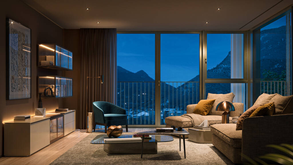 Leben mit natürlichem Licht Hohe Panoramafenster schaffen lichtdurchflutete Räume und bieten einzigartige Ausblicke auf die Dächer der Stadt, den umgebenden Park und die Berge. Die Wohngebäude sind eingebettet in eine begrünte Dachlandschaft. In privaten Gärten, Loggien oder Terrassen genießen Sie Ruhe und Natur und sind dabei mitten in der Stadt.