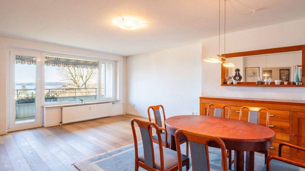 Die Wohnung selbst verfügt über ca. 90 m² Wohnfläche und wurde vor einigen Jahren umfassend modernisiert. Herzstück ist das großzügige Wohnzimmer mit offener Küche, von dem aus Sie beim Kochen und Wohnen stets den Blick auf das Wasser genießen. Die stilvolle Einbauküche fügt sich harmonisch in den Wohnbereich ein, während der Parkettboden in warmer Eichenoptik für ein elegantes und wohnliches Ambiente sorgt.