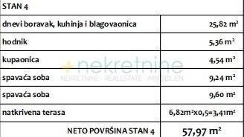 Stan S4 nalazi se na prvom katu zgrade C i sastoji se od ulaznog hodnika (5,36 m), dnevnog boravka s kuhinjom i blagovaonom (25,82 m), dvije spavace sobe (9,24 m i 9,60 m), kupaonice (4,54 m) te natkrivene terase povrsine 6,82 m (obracunski 3,41 m). Neto povrsina stana iznosi ukupno 57,97 m. Stanu pripada i vanjsko parkirno mjesto unutar okucnice zgrade.