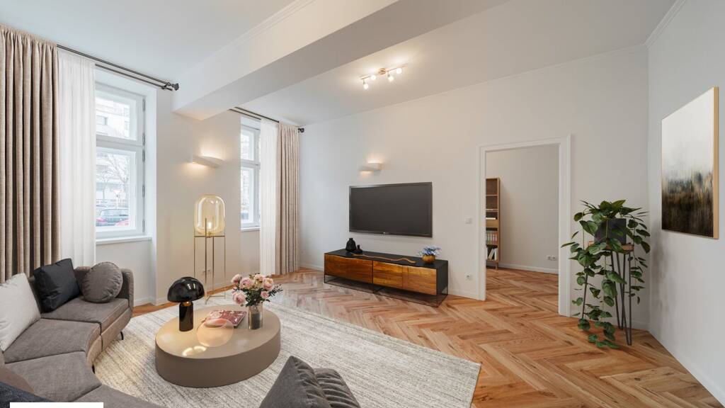 In der eben sanierten Stilaltbau-Wohnung lässt sich eine gediegene Ausstattung mit einer erlesenen Auswahl an Materialien genießen. Die Wohnung wurde mit aufwendig verlegtem Fischgrät-Eichenparkett und mit stilvollen Kassettentüren ausgestattet. Eleganter Deckenstuck und feine Vertäfelungen unterstreichen den einzigartigen Alt-Wien-Charakter. Traditionelle Holzkastenfenster, die durch moderne Isolierverglasung aufgewertet wurden zieren straßenseitig die Fassade. Das moderne Bad begeistert dank Markensanitärprodukten, einer Einbauwanne und einer Dusche mit erstklassiger Qualität, Komfort und Design.