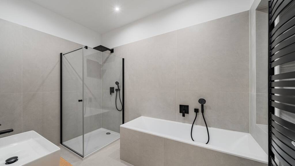 * Badezimmer mit Waschtisch, Badewanne, Dusche und Markensanitär