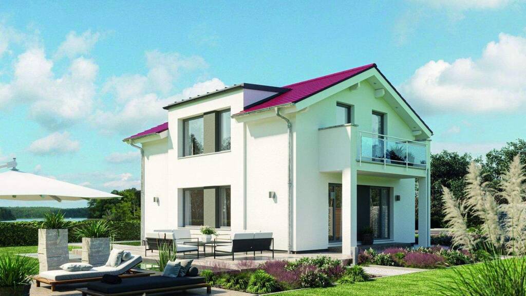 Objekt projektiert. Das Einfamilienhaus mit Satteldach ist nach wie vor der am häufigsten gebaute Haustyp. Kein Wunder, bringt diese Dachform doch zahlreiche Vorteile mit sich: Zum einen ist sie einfach in ihrer Konstruktion, zum anderen nahezu überall baurechtlich umsetzbar. Dabei eröffnet die moderne Satteldacharchitektur einen großen Gestaltungsspielraum. Ob weite Dachüberstände oder ganz ohne, ob steil oder flach geneigt: Stilgerecht erfüllt das Dach die individuellen Ansprüche der Bauherren. Bei diesem Hausentwurf sorgt die flache Neigung im Zusammenspiel mit dem pultdachgekrönten Zwerchgiebel für ein sehr modernes, geradliniges Erscheinungsbild. Weite Dachüberstände und die leuchtend rote Eindeckung knüpfen an die traditionelle Bauweise an. Damit passt sich das Fertighaus auch in gewachsene Baugebiete harmonisch ein. Ein schönes Detail ist der von Stützen getragene Balkon, der das Dachgeschoss um ein sonniges Plätzchen unter freiem Himmel erweitert und die Terrasse zudem vor Regen schützt. Das Innere des Hauses überzeugt mit einem klaren, leicht verständlichen Grundriss, der sich am Alltag einer vierköpfigen Familie orientiert. Empfangen werden die Bewohner und Besucher von einer geräumigen Diele, in der sich auch mehrere Personen gleichzeitig aufhalten können, ohne dass Gedränge entsteht. Rechts schließt sich der Technikraum und links das Gäste-WC an. Über einen offen Durchgang gelangt man von der Diele direkt in den Wohn- und Essbereich, wo man es sich entweder am großen Esstisch oder auf der Couch gemütlich machen kann. Die Küche wurde über Eck halboffen an das Raumensemble angegliedert. So haben Gäste nicht ständig Töpfe und Geschirr im Blick. Vorräte und andere Dinge, die man nicht täglich benötigt, verschwinden ordentlich in der Abstellkammer unter der viertelgewendelten Treppe. Das Dachgeschoss ist für die Privaträume reserviert. Die Wohnfläche teilen sich zwei große Kinderzimmer, der Elternschlafraum sowie ein schönes Familienbad mit ausreichend Platz für eine Wanne und eine bodengleiche Dusche im XL-Format.