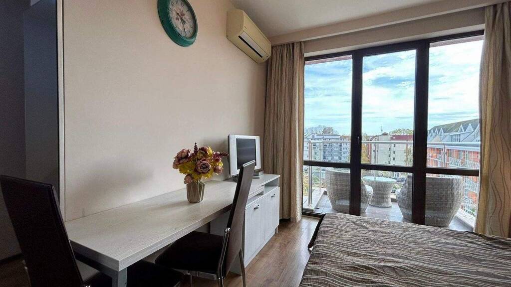 Wir bieten Ihnen ein geräumiges Studio mit Fernblick im beliebten Tarsis 3 Komplex in Sonnenstrand, Bulgarien.