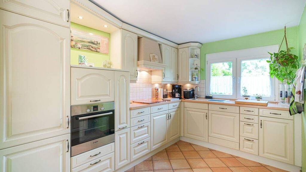 Das Haus selbst präsentiert sich als gepflegter Bestand mit angenehmer Wohnatmosphäre und solider Basis. Im Inneren sorgt die offene Verbindung von Wohnen und Essen für ein großzügiges, kommunikatives Raumgefühl. Ein Kamin setzt dabei einen wohnlichen Mittelpunkt und verleiht dem Alltag eine warme, behagliche Note. Die vorhandene Küche ist funktional ausgestattet und auf praktische Nutzung im täglichen Leben ausgelegt.