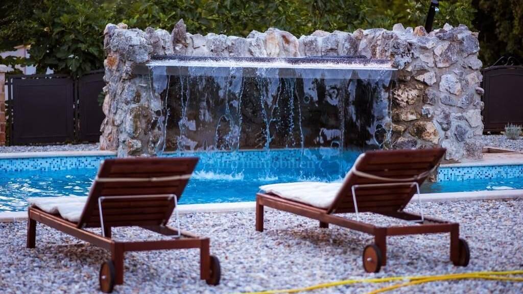 Dieses schöne Steinhaus befindet sich mitten in der Natur in ruhiger Lage in Vrbnik, einer malerischen Siedlung auf der Ostseite der Insel Krk. Es hat eine Fläche von 80 m2 und besteht aus zwei schönen Schlafzimmern, zwei Badezimmern, einer modernen grauen Küche mit Esszimmer und einem gemütlichen Wohnzimmer. Vom Wohnzimmer aus haben Sie Zugang zu einer überdachten Terrasse und einem weitläufigen Garten mit einem einzigartigen Swimmingpool mit einer Grotte und einem Wasserfall, ideal für Sommerfeste im Freien und zum Genießen der Geräusche des gurgelnden Wassers und der umliegenden Natur. Auf der anderen Seite des Hauses befindet sich eine Spiel- und Sportecke mit Korb für Basketball- und Kickerfans, etwas weiter ein Trampolin für Kinder. Der weitläufige Garten ist 1.000 m2 groß mit einem Wald von 2.000 m2, was diese Immobilie zu etwas Besonderem macht. Es ist mit vier Sternen kategorisiert und ist eine ideale Gelegenheit, in den Tourismus zu investieren.