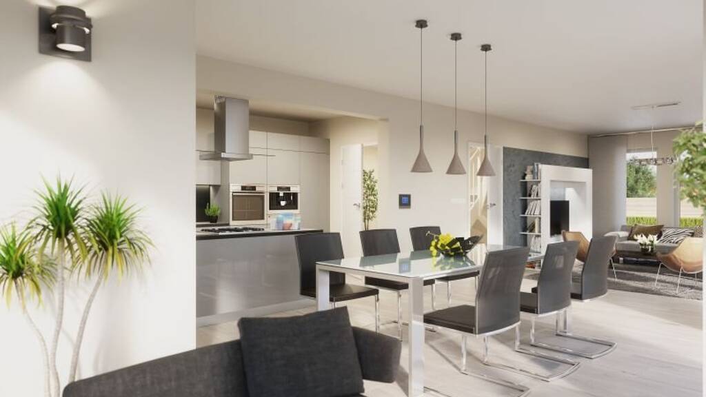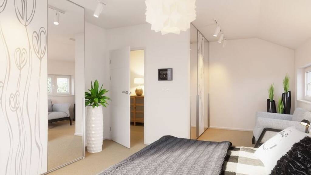 Beeindruckend ist die über 55 m² große und offene Raumkombination von Kochen, Essen und Wohnen in Verbindung mit dem großzügig verglasten Panorama-Cube. Auch ein Gästezimmer, das auch als Büro genutzt werden kann sowie ein Dusch-WC finden im Erdgeschoss ihren Platz. Im oberen Stockwerk ist Platz für zwei Kinderzimmer, das Elternschlafzimmer mit Ankleide und ein modernes Familienbad mit T-förmigem Zuschnitt.