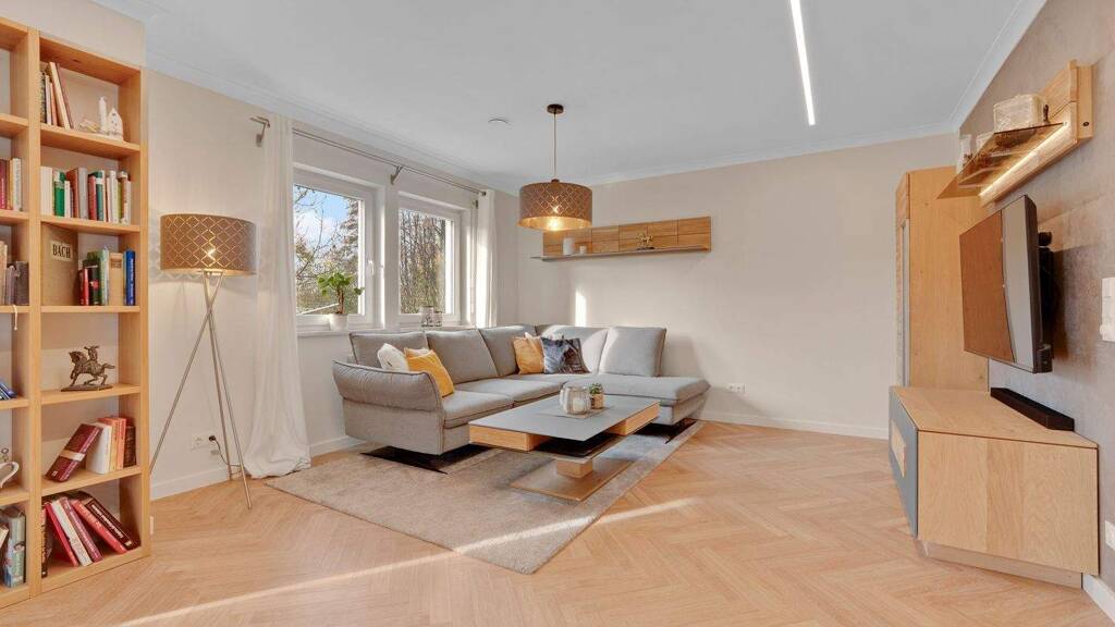 Im Inneren überzeugt das Haus durch stilvolle Ausstattung und klare Raumaufteilung. Das Erdgeschoss mit 2,55m Deckenhöhe bietet eine helle Diele mit satinieren Glastüren, ein separates Arbeitszimmer mit Kirschbaumparkett sowie ein modern gefliestes Gäste-WC mit Fenster. Der offen gestaltete Wohnbereich mit Kaminofen, Fischgrätvinyl und großen Fensterflächen geht nahtlos in den Essbereich über, der direkten Zugang zur 56,62m² großen Terrasse mit Natursteinmauer und Pflanzbeet bietet. Die hochwertige Küche mit Kochinsel und Geräten (Kaufpreis 10.000€) rundet das Ensemble ab. Im Obergeschoss befinden sich zwei helle Kinderzimmer, ein großes Schlafzimmer mit Ankleide, ein Abstellraum sowie ein großzügiges Bad mit Wanne, Dusche und Doppelwaschbecken. Der Keller bietet Hauswirtschaftsraum, Werkstatt, Abstellflächen sowie einen flexibel nutzbaren Raum mit Außenzugang.