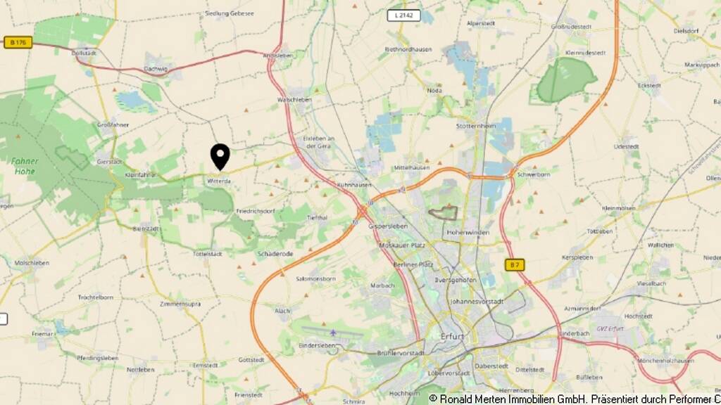 Das Gelände unseres Mietangebotes liegt ca. 9 km nördlich von Erfurt und ist über die Bundesstrasse B4 einfach zu erreichen. Die überregionale Anbindung erfolgt über die Autobahn A71 am Kreuz Gispersleben in ca. 7 km Entfernung.