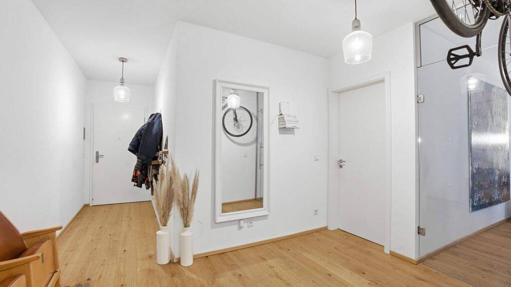 Bereits beim Betreten vermittelt die Wohnung mit einer Deckenhöhe von ca. 2,40 m ein großzügiges Raumgefühl. Alle Zimmer sind praktisch vom zentralen Flur aus zugänglich, was die klare und funktionale Grundrissgestaltung unterstreicht. Der lichtdurchflutete Wohn- und Essbereich bildet das Herzstück der Wohnung und wird durch eine elegante Glastür stilvoll vom Flur getrennt. Hochwertige Bodenbeläge aus Eichendielenparkett in den Wohnräumen sowie geschmackvolle Fliesen in den Bädern sorgen für eine zeitlose, exklusive Atmosphäre. Die komfortable Fußbodenheizung trägt zusätzlich zu einem angenehmen Wohnklima bei.