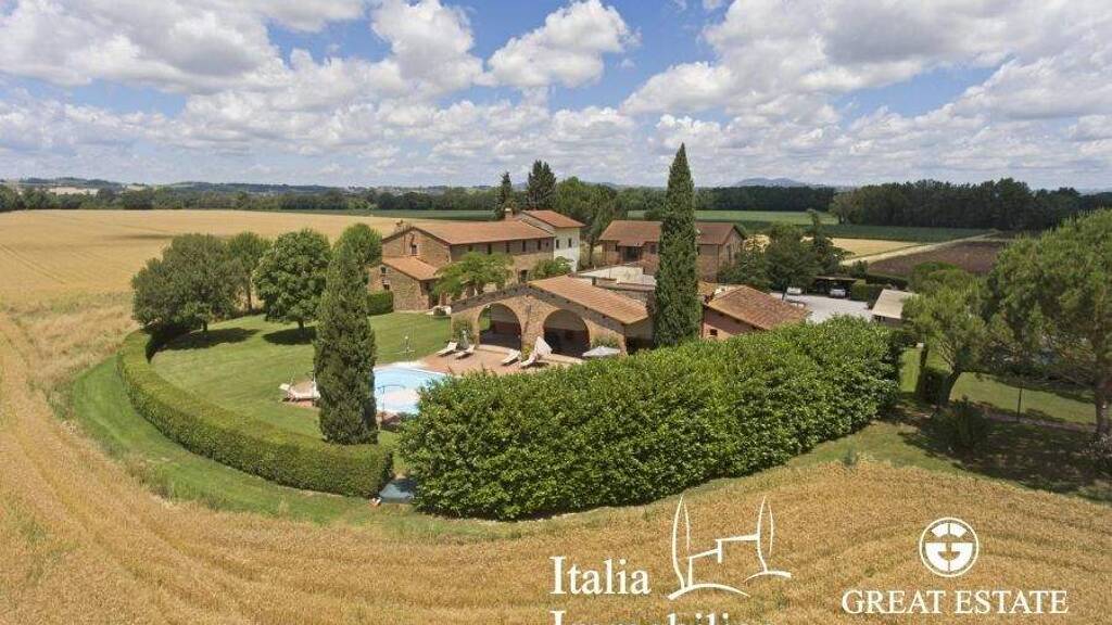 In der Nähe der Keramikstadt Deruta, am Tiber, liegt diese schöne Ferienanlage, die aus 3 Bauernhäusern mit einer Gesamtfläche von ca. 1250 m² und einem gepflegten Garten mit Swimmingpool besteht. Das Grundstück hat eine Größe von ca. 4 ha. Wenn man den Hof betritt, befindet sich auf der rechten Seite das erste Bauernhaus, das über einen eigenen Eingang verfügt und im Erdgeschoss ein Restaurant mit Küche, Badezimmer für Gäste und Personal, Garderobe und Abstellraum beherbergt. Steigt man die Außentreppe des Bauernhauses hinauf, gelangt man in einen geräumigen Raum mit einem großen Kamin. Von diesem Wohnzimmer aus gelangt man in den Schlafbereich, wo sich 4 Schlafzimmer (2 Dreibettzimmer, 2 Doppelzimmer) mit eigenem Bad befinden. Wenn man die Treppe hinaufgeht, gelangt man auf eine kleine Terrasse, von der aus man 2 Zweizimmerwohnungen erreicht, die jeweils aus einem Eingangsbereich, einer Kochnische mit Schlafsofa, einem Schlafzimmer mit Doppelbett und einem Badezimmer bestehen. Das Hauptgebäude besteht aus 2 Etagen: im Erdgeschoss gibt es eine Wohnung mit Eingangsbereich, Kochnische, Schlafsofa, Schlafzimmer mit Doppelbett und Bad und eine weitere Wohnung mit Eingangsbereich, Kochnische, Schlafsofa, Schlafzimmer mit Doppelbett und Bad. Hinzu kommen ein Empfangsbereich, ein gemeinsamer Aufenthaltsraum, eine Küche und ein weiteres Badezimmer. Über die Innentreppe gelangt man in den ersten Stock, in dem sich eine Wohnung mit Wohnzimmer, Kochnische, 2 Doppelschlafzimmern und 1 Bad befindet. Weiter geht es in ein großes Wohnzimmer mit einem imposanten Kamin, wo auf halber Höhe eine Tür ist, die zu 2 Doppelzimmern mit Bad und 2 Dreibettzimmern mit Bad führt. Im dritten Wohnhaus befinden sich 4 Zweizimmerwohnungen mit Wohnzimmer und Kochnische, Bad und Schlafzimmer mit Doppelbett, 1 Doppelzimmer mit Bad, ein Barbereich mit Küche und Bädern für den Pool. Im gleichen Haus auf der Poolseite und gegenüber befinden sich zwei große Veranden. Im schönen Garten gibt es einen 16x7 m großen Swimmingpool und eine Grünfläche, die als Spielplatz genutzt wird.