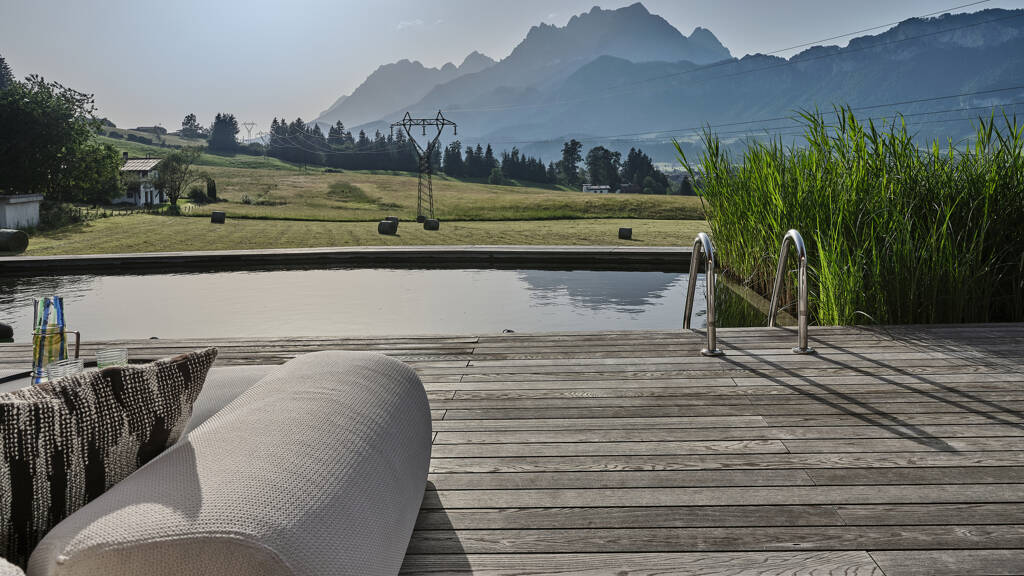 Von der Etage aus gelangt man auf die 340 m² große Terrassenfläche, die sich von Osten nach Westen erstreckt und an einen 120 m² großen Garten grenzt. Ein Pavillon bietet Platz für einen geschützten Ess- und Loungebereich. Eine Outdoor-Küche, ein Naturpool sowie eine Außendusche vervollständigen das Outdoor Angebot.