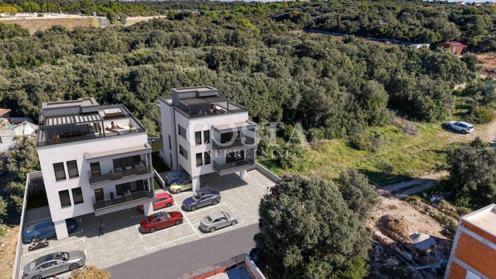 Zum Verkauf steht ein im Bau befindliches Penthouse im ruhigen Dorf Petrcane bei Zadar. Die Wohnung befindet sich im zweiten Obergeschoss eines kleinen Wohnhauses mit insgesamt vier Wohneinheiten. Die Wohnfläche beträgt 44,61 m² und umfasst zwei Schlafzimmer, ein Wohnzimmer, eine Wohnküche, ein Badezimmer, einen Flur und eine 10,50 m² große Terrasse.