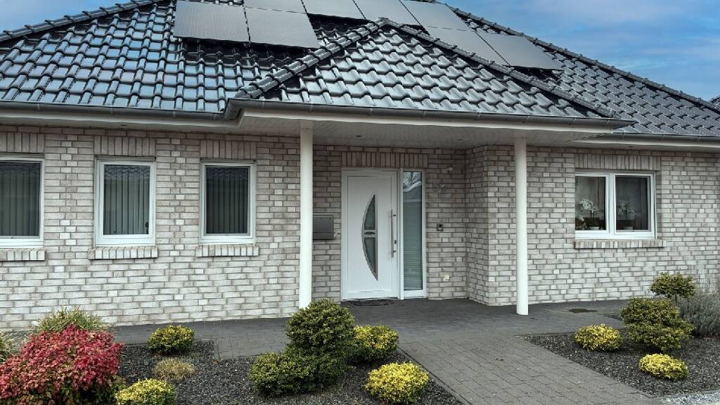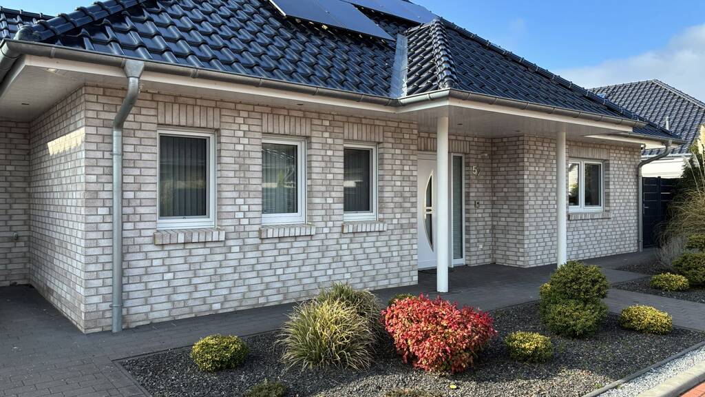 Dieser repräsentative Winkelwalmdachbungalow mit Wintergarten und Garage wurde im Jahr 2020 in massiver Bauweise errichtet und präsentiert sich als ein Wohndomizil von besonderer Eleganz sowie zeitloser Wertigkeit.