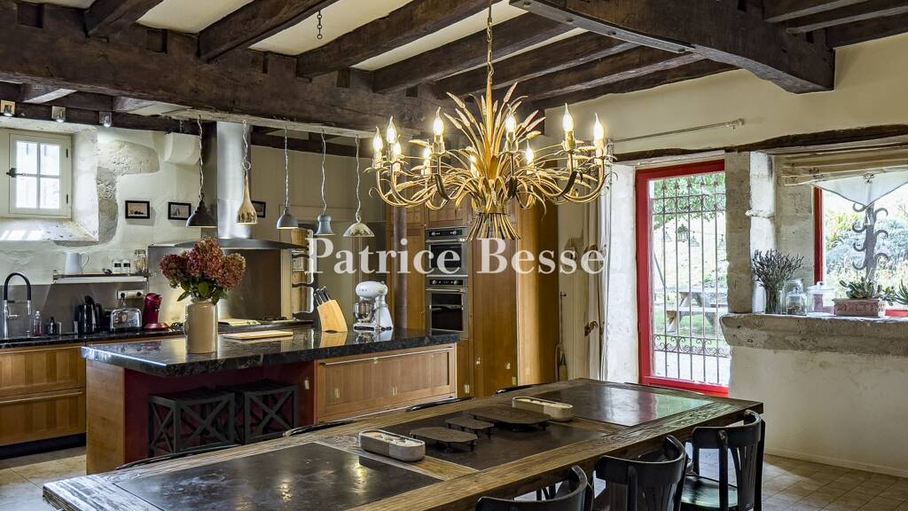 The heavy studded wooden main entrance door opens onto the landing of a stone staircase without any gaps between the stringers, leading down to the cellars and the former underground passageway, and up to the first floor. The start of each of the two flights of steps is framed by a basket-handle arch adorned with a coat of arms and a carved pilaster. The wooden ceiling rests on finely carved joists with a pattern identical to that of the adjoining sitting room. The latter showcases wooden features, from the original ladder parquet to the beamed ceiling, a large fireplace with a straight hood, panelled doors and walls with carved woodwork. The room is flanked by a bedroom in the same style and a vast, dual-exposure dining room/sitting room, which is very bright thanks to the later addition of a semi-circular arched French window overlooking the lawned garden. The meticulous restoration, using noble materials, as in the adjoining kitchen, has highlighted the existing architectural features - the vegetable plot, the fireplaces and the recesses - while providing a high degree of living comfort.