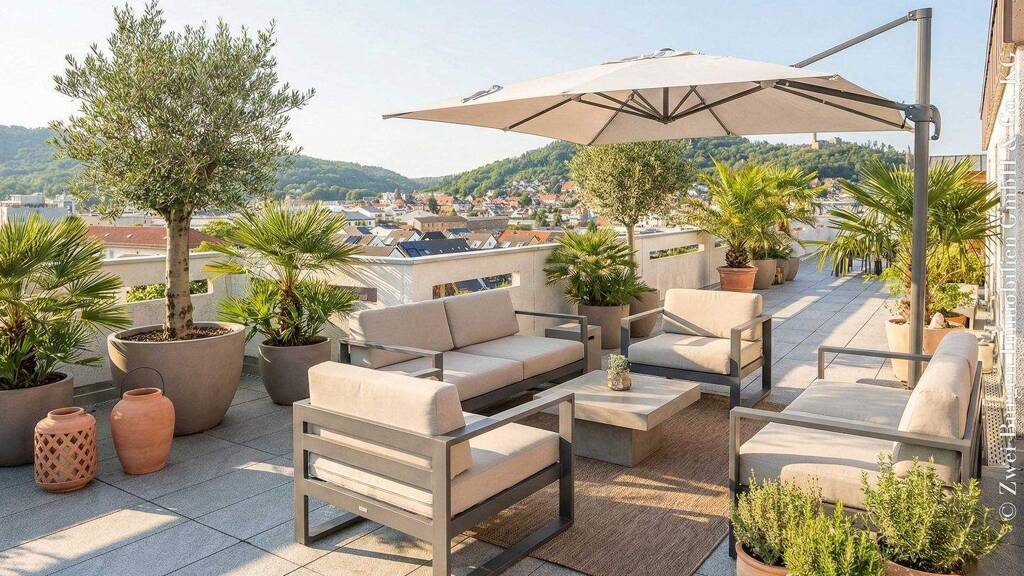 Daten auf einen Blick: - Wohnfläche: Ca. 135 m² (ohne Dachterrasse), großzügige und helle Räume - Dachterrasse: ca. 130 m² mit Blick in alle Himmelsrichtungen (inklusive Gartenhaus) - 4 Zimmer (davon 3 Schlafzimmer, 2 mit Terrassenzugang) - Küche: Halboffene Küche mit moderner Kochinsel, Marken-Geräten (bereits im Kaufpreis enthalten) & praktischer Speisekammer - Bäder: Modernisiertes Wellness-Bad (freistehende Wanne, große Duschkabine) + separates Gäste-WC - Komfort: Fußbodenheizung mit hellen Fliesen im gesamten Wohnbereich - vollständige Sanierung (Terrasse und Innenausbau) vor ca. 12 Jahren - Ein Kfz-Stellplatz kann ggf. angemietet werden