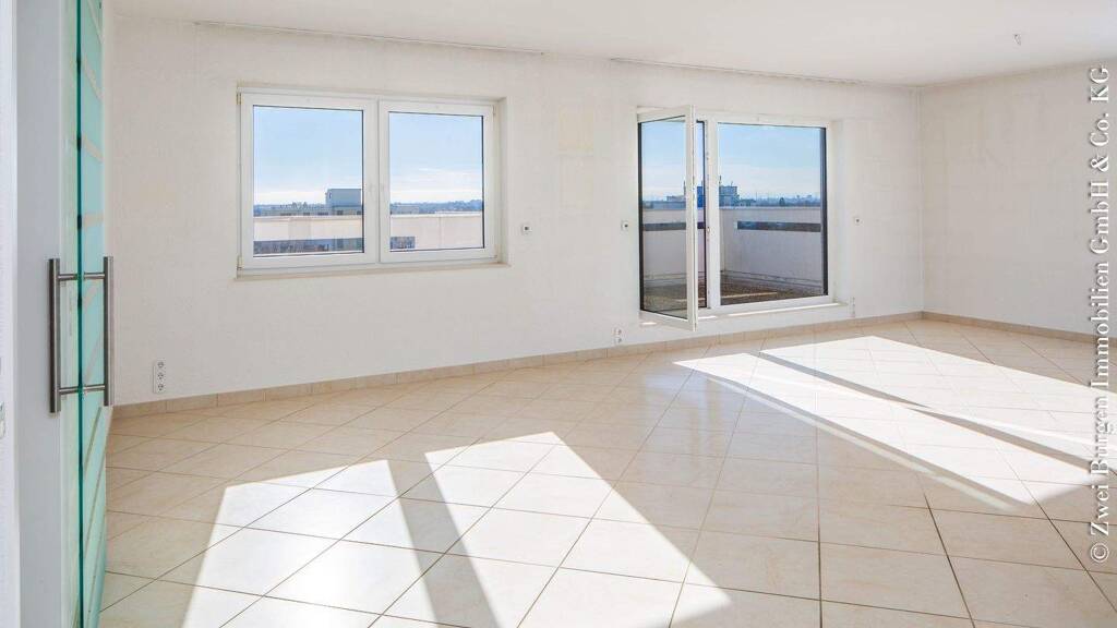 Das Herzstück der Wohnung ist der weitläufige Wohn- und Essbereich mit großen Fensterfronten und direktem Zugang zur Süd- sowie Nord-West-Terrasse. Die Immobilie wurde vor etwa 12 Jahren aufwendig saniert und ist ab sofort bezugsfrei. Ein Aufzug bringt Sie bequem bis auf die Penthouse-Ebene (Zugangsbereich zum Aufzug mit ca. 6 Stufen)