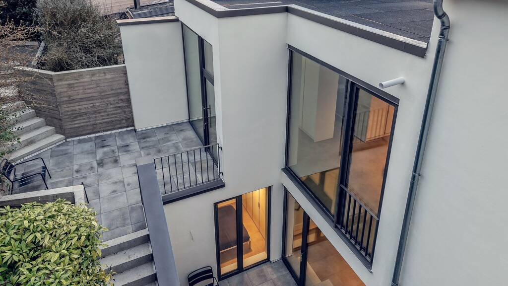 Im Gartenbereich findet sich die Terrasse mit hochwertigen und designorientierten Sitzmöbeln, sowie einen im Preis enthaltenen Stellplatz.