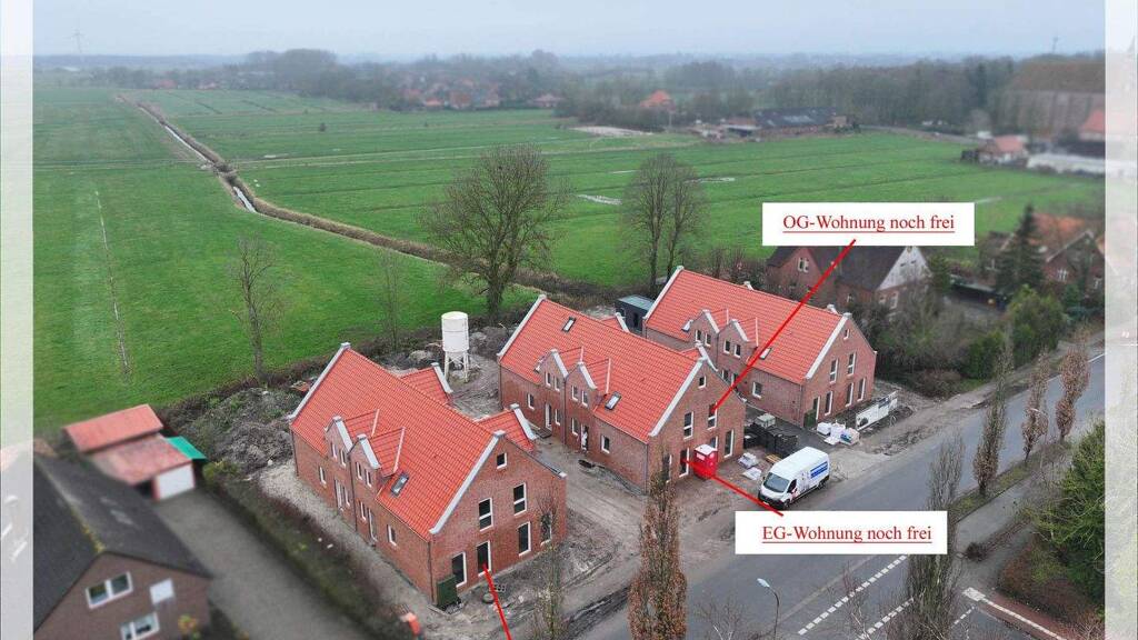 Diese Neubau Obergeschosswohnung wird schlüsselfertig in einer zentralen, ruhigen Wohnlage von Hinte erstellt. Das Mehrfamilienhaus besteht insgesamt aus vier Wohnungen und liegt in einer ruhigen Wohnlage von Hinte. Die Stadt Emden erreichen Sie in wenigen PKW-Min.. Die gute Ausstattung dieser Wohnung erstreckt sich über: weiße Kunststofffenster mit Sprossen/3-fach Verglasung, Außenjalousien mit Elektroantrieb, Fußbodenheizung in jedem Raum, hochwertige weiße Innentüren, gute Sanitärausstattung, Balkon, fertig angelegter Garten (Rasen und Pflanzen), fertig gepflasterter Hauszugang und PKW-Einstellplatz. Jede Wohneinheit verfügt über einen eigenen PKW-Einstellplatz und sep. Versorgungsanschlüsse (Wasser, Strom). Die Fertigstellung erfolgt 2026 durch eine renommierte, etablierte Firma aus der Region. Diese seltene Gelegenheit überzeugt durch ein gelungenes Raumkonzept und einer schönen Wohnlage in Hinte. Gerne vermitteln wir Ihnen auf Wunsch die passende Finanzierung. Der Abstellraum/Heizungsraum verfügt über Anschlüsse für eine Waschmaschine/ Trockner. Eine ausführliche Baubeschreibung erhalten Sie auf Anfrage. Beheizt wird das Objekt durch eine Luft-/ Wärmepumpe.