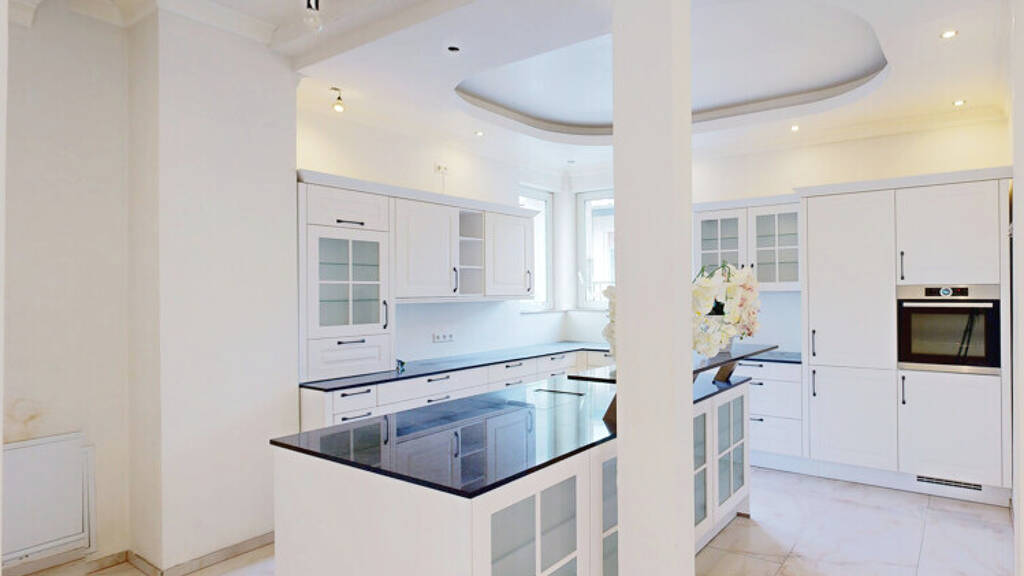 Herzstück der Villa ist der offen gestaltete, lichtdurchflutete Wohn- und Essbereich im Erdgeschoss mit nahezu 70 m², integrierter, voll ausgestatteter Küche, stimmungsvoller Beleuchtung und Fußbodenheizung. Großformatige, helle Fliesen unterstreichen das moderne Wohngefühl.