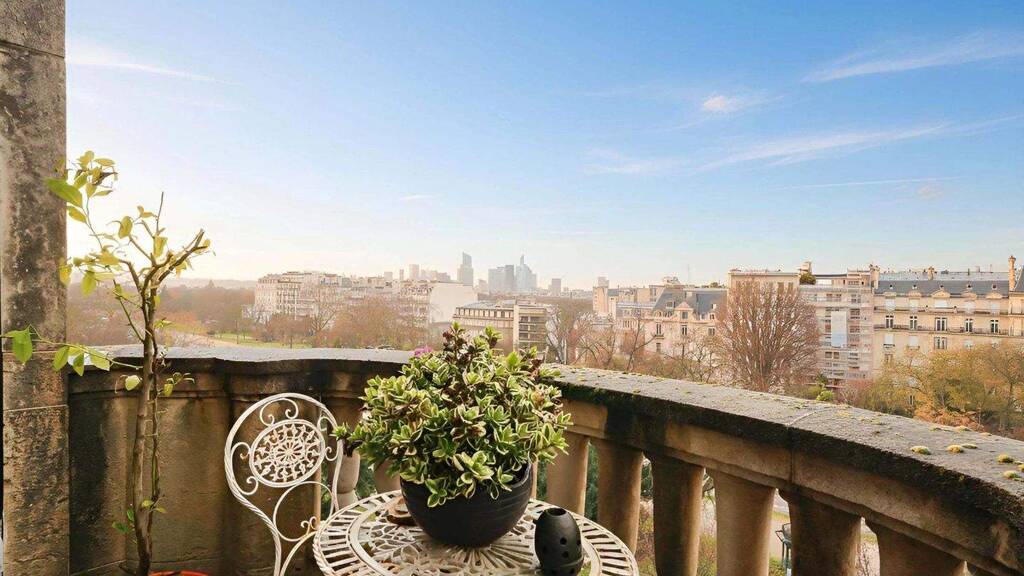 Located on the 7th floor, the first level comprises a living room offering unobstructed views of Avenue Foch and La Defense, with direct access to a vast stone balcony, as well as a dining room, a separate kitchen, a checkroom and a shower room.