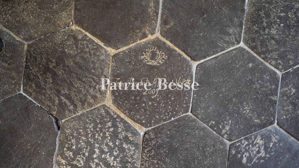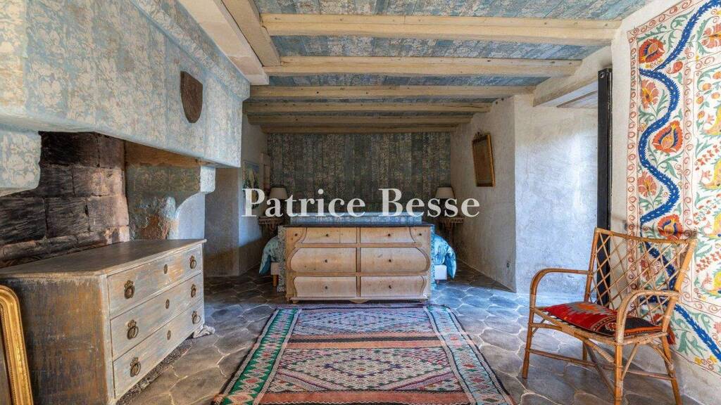 From the pedestrian gate, a stone paved path leads to the entrance and the various rooms behind its door, including a kitchen paved with hexagonal terracotta tiles. Half of the walls' height is covered with enamelled tiles and their rounded edges form the border with the lime and sand rendering above. This space spreads out beneath exposed beams and is bathed in light through small-paned doors and windows, fitted with interior and exterior shutters, on the south and west facing elevations. The kitchen opens into a dual aspect, east to west lounge, paved with terracotta tiles boasting floral decorations. The stone fireplace is highlighted by the presence of a work by painter and sculptor Pierre Carron, while a reproduction of a Neapolitan creation, by Ernest Pignon-Ernest, adorns one of the walls. Off this room on one side, there is a shower room, with a lavatory, boasting shell-like decorated floor tiles and white tiled walls, punctuated by delicate friezes of cherubs. On the other side, a dining room enjoys a remarkable view of the surrounding countryside. The hexagonal or diamond shaped, ...