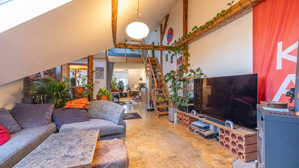 Die Wohnung verfügt über zwei gut geschnittene Schlafzimmer sowie ein Badezimmer mit Tageslichtfenster. Ein besonderes Highlight ist der über eine Holztreppe erreichbare Galeriespitz, der sich flexibel als Büro, weiteres Schlafzimmer oder praktische Abstellfläche nutzen lässt.