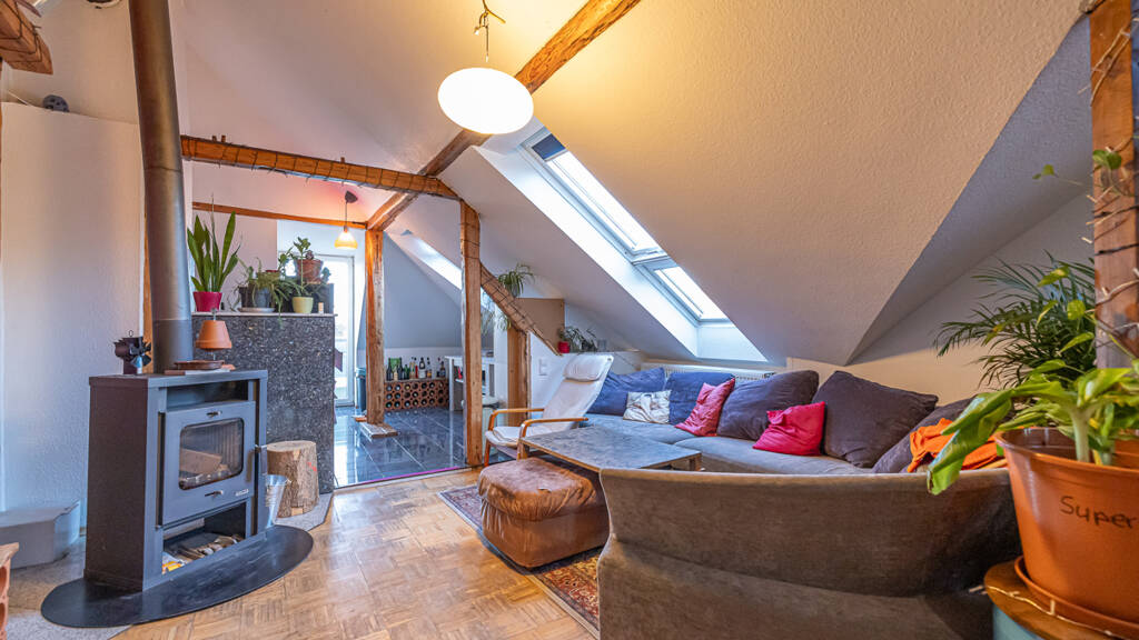 Das Herzstück der Wohnung ist der großzügige, offen gestaltete Wohn- und Essbereich mit angrenzender Küche. Ein Ofen sorgt hier für eine angenehme, behagliche Wärme und schafft eine besonders wohnliche Atmosphäre. Von hier aus gelangen Sie auf den im Jahr 2020 angebauten großen Balkon mit 10 qm, der einen wunderbaren Blick über die Dächer von Karlsruhe bietet - ein idealer Ort zum Entspannen.