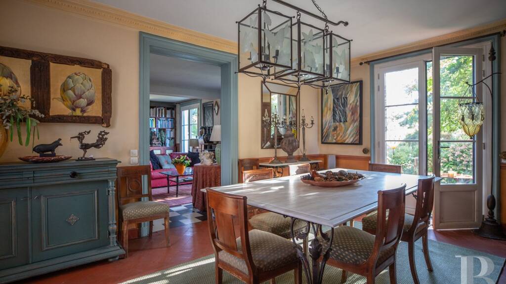 The main rooms of the house can be reached via the finely crafted, Eiffel-style conservatory that is bathed in light and which was renovated to a high standard by skilled craftspeople. The views through the glass make it feel open to the garden and it provides a gentle link between the outdoors and ground floor rooms. It leads to a vast lounge which in turn leads into a dining room. These generously sized rooms are linked to the former farmhouse which houses a large kitchen boasting a rustic ambiance. After the kitchen, a landing that opens onto the courtyard leads to a lounge/library with panelled cupboards full of books. The ochre-coloured or black and white chessboard tiles mix nicely with the rustic style of the exposed ceiling beams. Through the various rooms, the atmosphere alternates delicately between bourgeois and countryside tones. In the large lounge with wood panelled wainscotting, there is an imposing staircase with a wrought-iron balustrade decorated with Greek motifs leading upstairs. From the kitchen, there is a second, more country-style staircase that leads to other rooms upstairs. The various rooms as well as the garden and courtyard can be reached via elegant glazed or solid wood doors. The late 19th-century marble fireplace, ...