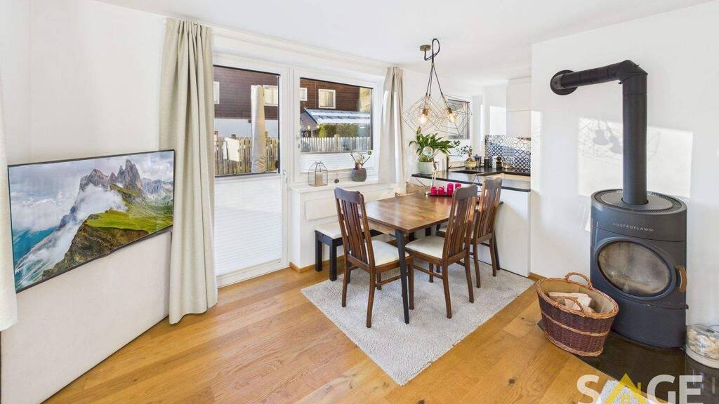 Die ca. 70 m ² Wohnfläche unterteilen sich auf 3 Zimmer, das geräumige Wohn- Esszimmer mit gemütlichem Holzofen und Ausgang auf die große Terrasse. Weiters gibt eine Schlafzimmer mit begehbarem Schrank und ein weiteres Zimmer, das derzeit als Arbeitszimmer genutzt wird. Ein angenehm helles Bad mit Tageslichtfenster, sowie ein Abstellraum runden das Raumprogramm ab.