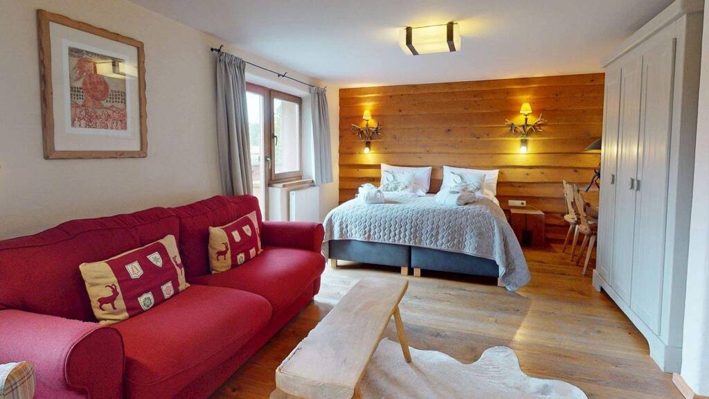W 13 / Superior Doppelzimmer #4 ist südseitig ausgerichtet und der Wohn- und Schlafbereich sind durch eine halbhohe Wand getrennt. Hier steht den Gästen neben einem Schlafsofa auch eine Kitchenette und Essecke zur Verfügung. Das Bad ist mit Badewanne, Waschbecken und WC ausgestattet. Die Wohnung hat 33,70 m² Wohnfläche und eine großzügige Sonnenterrasse mit 42 m².