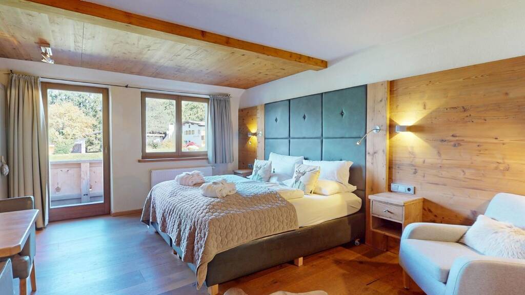 W 14 / Superior Doppelzimmer #5 ist ebenfalls südseitig ausgerichtet und bietet ähnlich wie #4, jedoch offener gestaltet auf einer Wohnfläche von 39,52 m² sowohl Schlafbereich, Kitchenette und Essecke, sowie Zugang zur Südterrasse mit über 16 m².