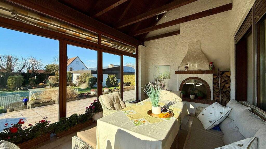 Der Wohn- und Essbereich bildet das Zentrum des Hauses und überzeugt durch seine Großzügigkeit sowie die lichtdurchflutete Gestaltung. Große Fensterflächen sorgen für eine helle, freundliche Atmosphäre und geben den Blick in den weitläufigen Garten frei. Der harmonisch platzierte Kamin verbindet Wohn- und Essbereich optisch und schafft insbesondere in den kühleren Monaten eine behagliche Stimmung. Die nach Süden ausgerichtete Terrasse schließt direkt an den Wohnbereich an und erweitert diesen in der warmen Jahreszeit um einen zusätzlichen Lebensraum im Freien. Der angrenzende Wintergarten ergänzt das Raumangebot sinnvoll und bietet einen geschützten, lichtdurchfluteten Bereich, der zu jeder Jahreszeit genutzt werden kann.